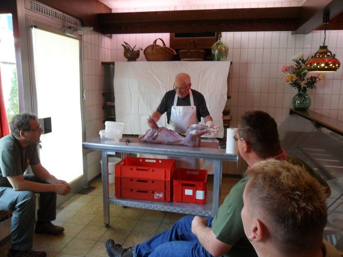 12 interessierten Teilnehmern zeigte Metzgermeister und Jäger Bernhard Geiser die Details beim Zerwirken von Rehwild. Dabei stand die Gewinnung eines qualitativ hochwertigen Lebensmittels im Mittelpunkt. Die Schnittführung beim Auslösen der einzelnen Wildbretteile war eine spannende Lektion für die Hegeringmitglieder. Bei heißer Wurst mit Weck wurde im Anschluss an den praktischen Teil noch weiter intensiv gefachsimpelt.