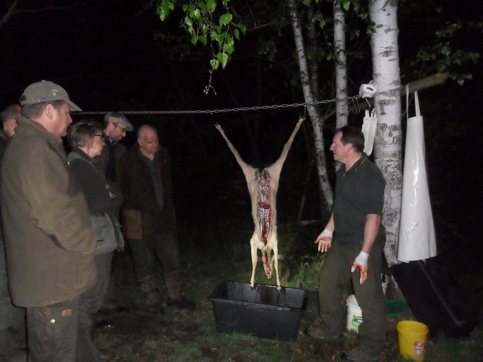 Im Anschluss traf man sich wieder um den Ausführungen Joachim Seegers, Metzgermeister und Jäger, zu folgen, der beispielhaft an einem Stück Rehwild die neuesten Erkenntnisse zur roten Arbeit nach dem Schuss erläuterte. Dabei stand besonders die Gewinnung eines hochwertigen Lebensmittels aus unserem heimischen Wild im Mittelpunkt. Beim darauffolgenden Grillen am Lagerfeuer wurde weiter gefachsimpelt.