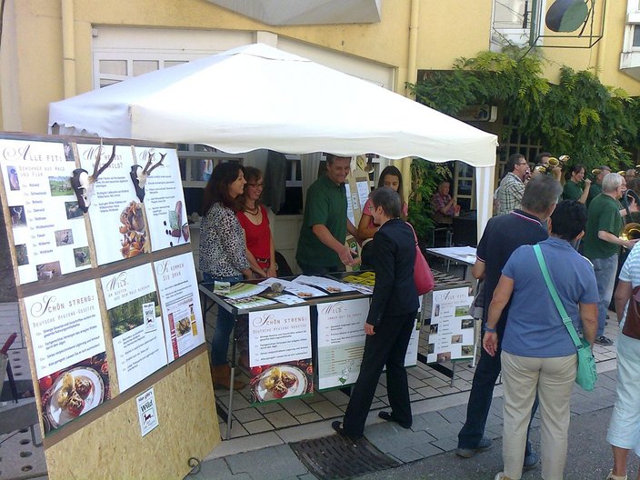Bei bestem Wetter informierten die Jäger Axel Pfannstiel, Andreas Posch und Peter Kremer von 9.00 bis 16.00 Uhr zahlreiche Marktbesucher über die Vorzüge des Verzehrs von Wildfleisch, mögliche Bezugsquellen und über Zubereitungsmöglichkeiten, nachdem schon im Vorfeld interessierten Pächtern des Hegerings die Möglichkeit angeboten wurde, sich durch die Auslage eigenen Prospektmaterials zu präsentieren.